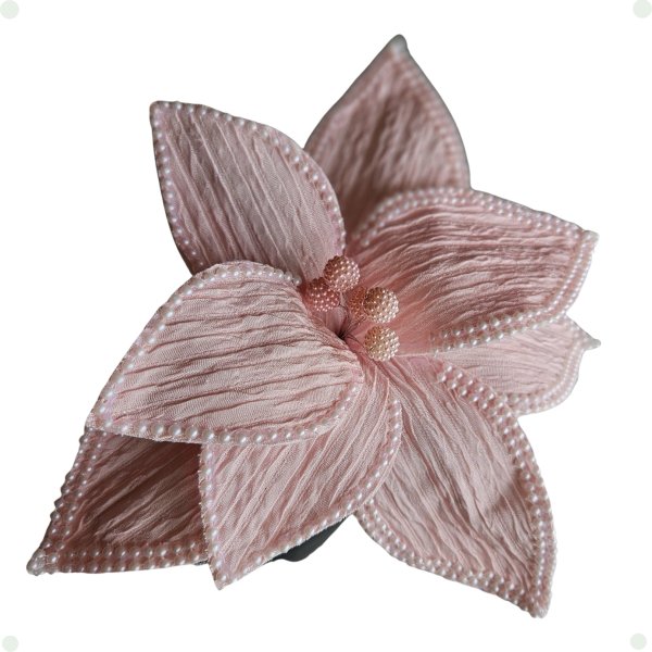 A Poinsetia Decorativa da Cromus traz um toque delicado, sofisticado e festivo para a sua decoração natalina. Com pétalas em tecido texturizado rosa claro e acabamento impecável em mini pérolas aplicadas manualmente nas bordas, ela é ideal para composições elegantes em guirlandas, árvores de Natal, arranjos florais e centros de mesa.