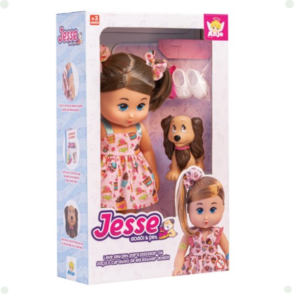 A Jesse é uma linda boneca de 37cm em 100% em vinil atóxico. Leve e macia, com olhos coladas e com um cheirinho delicioso. Acompanha uma linda linda cachorrinha também em 100% em vinil atóxico, coleira e sapatinhos.